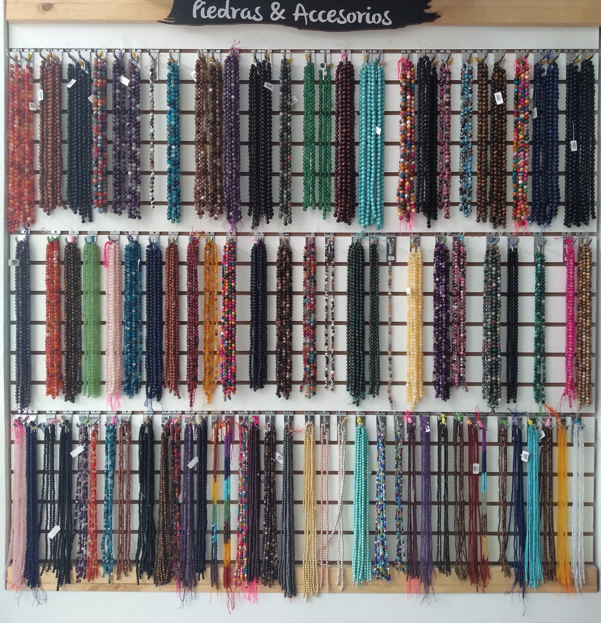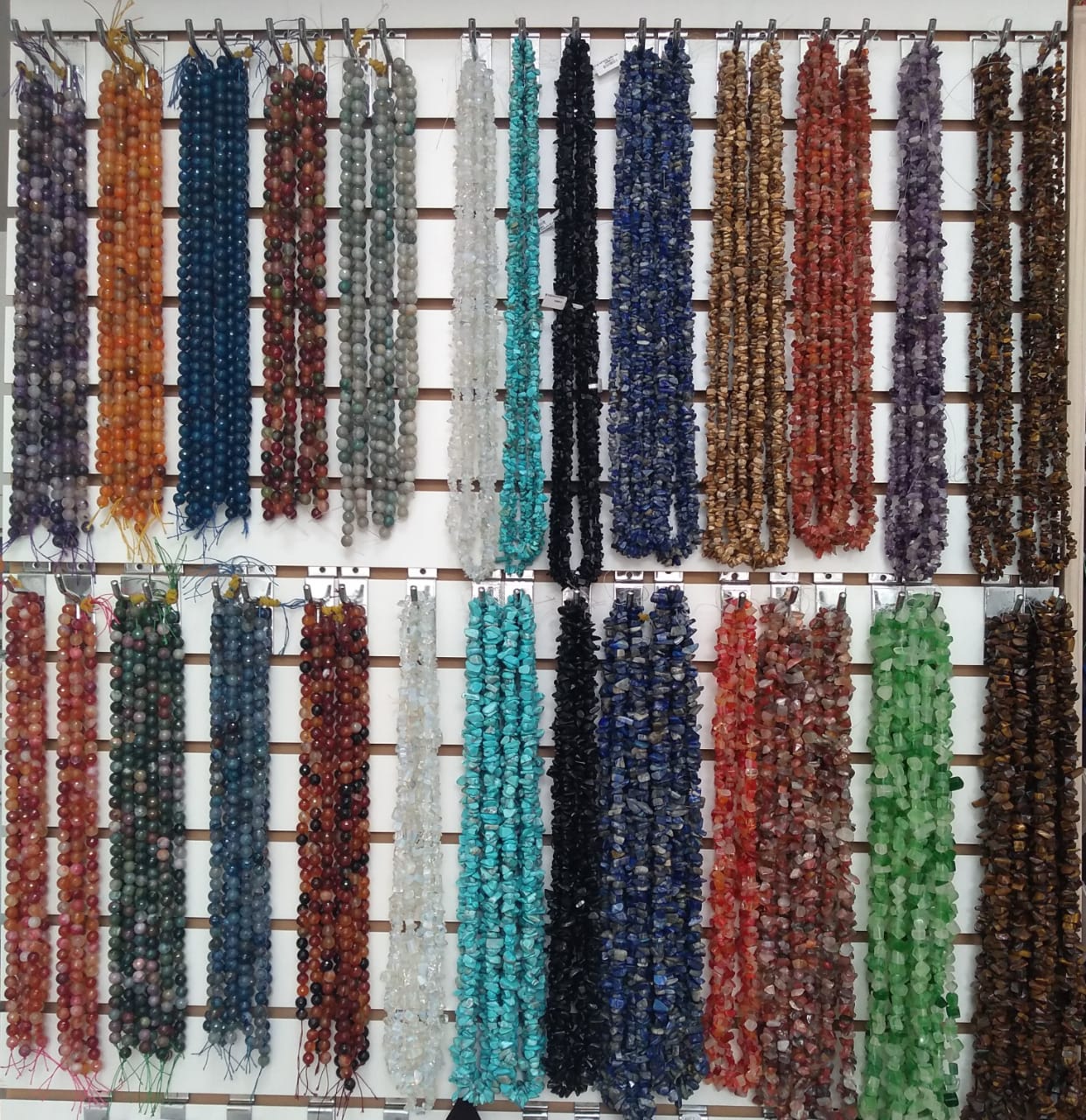 Ágatas, amatista, lapislázuli, Onix, Obsidiana, Turquesa, Aventurina, Ojo de tigre, Apatita, Cornalina, Cuarzos, Sodalita, Malakita y más.